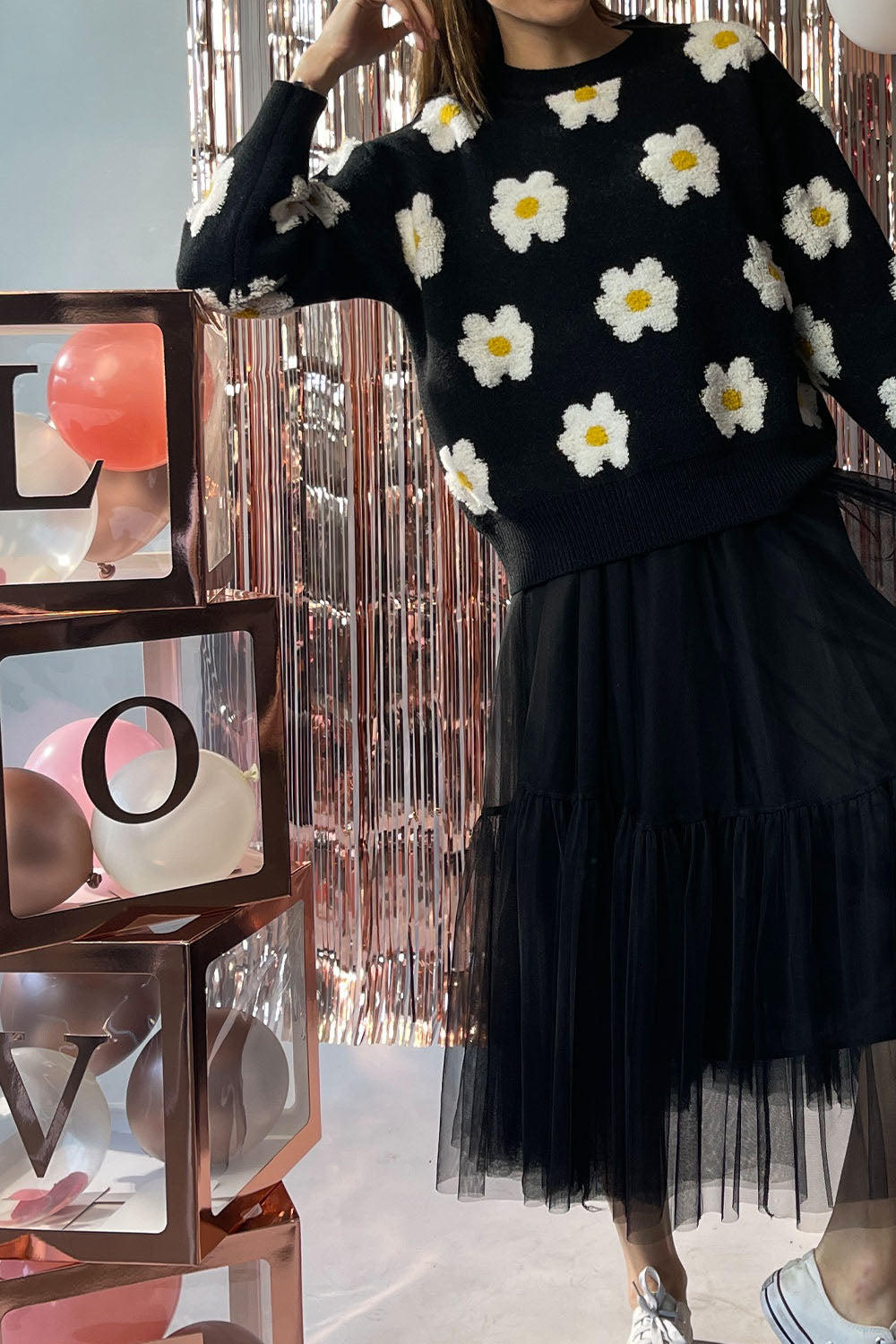 Pair with a tulle skirt for a dreamy, romantic look (as pictured), or with wide-leg jeans and sneakers for a playful street-style vibe. For colder days, layer over a collared blouse to add a touch of preppy charm.